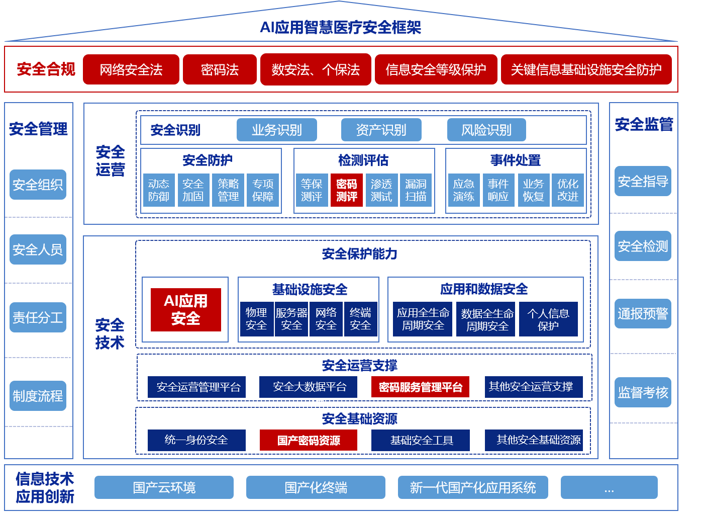 嚴(yán)格遵循《密碼法》《醫(yī)療衛(wèi)生機(jī)構(gòu)網(wǎng)絡(luò)安全辦法》等國(guó)家級(jí)法律法規(guī),創(chuàng)新性地將商用密碼技術(shù)與AI醫(yī)療應(yīng)用場(chǎng)景深度融合,構(gòu)建覆蓋數(shù)據(jù)全生命周期的安全防護(hù)體系。