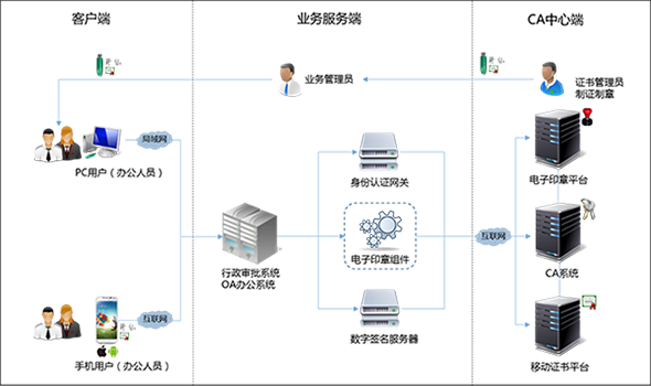 針對(duì)行政審批的安全需求,安信CA基于第三方數(shù)字證書、電子簽名及電子簽章等技術(shù)來(lái)保障業(yè)務(wù)辦理過(guò)程中的身份真實(shí)性、數(shù)據(jù)安全性、數(shù)據(jù)完整性及操作不可抵賴性,系統(tǒng)架構(gòu)如下圖所示: